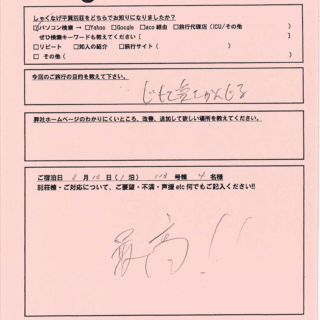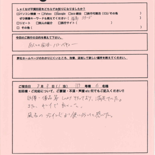 お客様の声では、ご宿泊されたお客様からいただいたご意見を一部ご紹介させていただいております。 ご宿泊を決める際のご参考にしていただけたら幸いです。